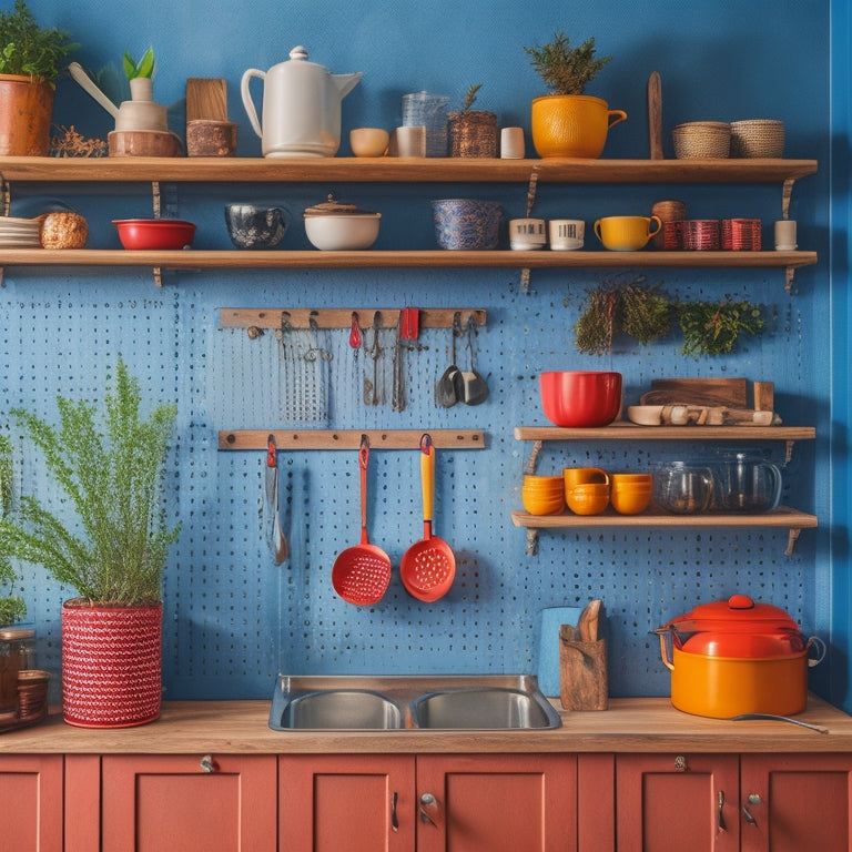 Start by selecting a pegboard in a hue that complements your kitchen's palette. Then, use color coordination to categorize your essentials—group your pots, pans, and cooking gadgets by color for an artistic flair. Consider adding hooks and shelves in contrasting shades to enhance the visual appeal while maintaining practicality.