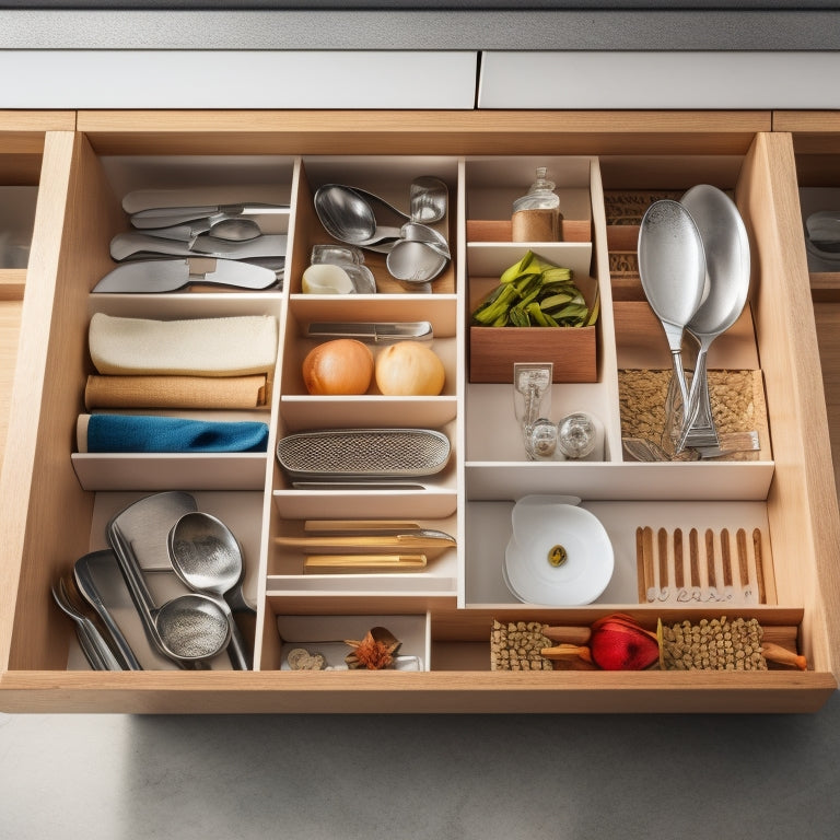 Don't forget to account for any additional accessories or gadgets that require their own compartments. By choosing the right dividers based on your drawer's dimensions, you'll maximize your kitchen's organization and functionality.