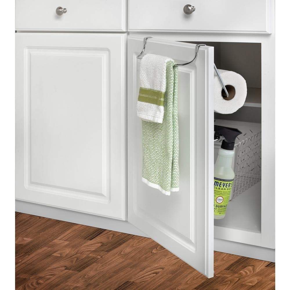 - Towel bar accommodates hand and dish towels while the opposite side holds paper towels and up to three spray bottles