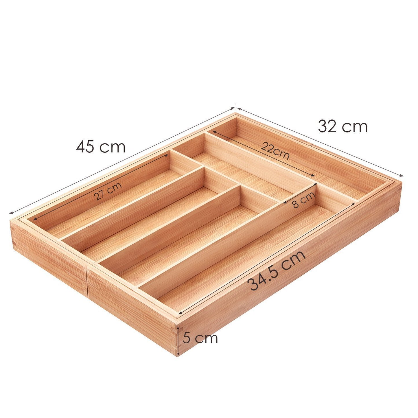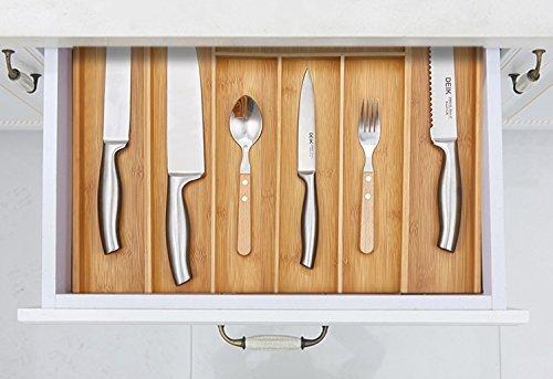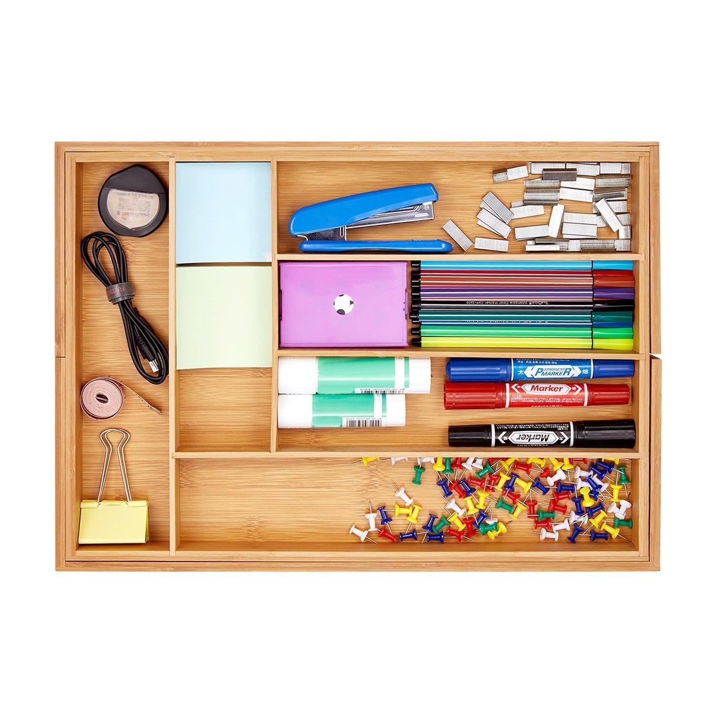 This elegant and durable bamboo drawer organizer makes you proud to open your drawers wide again. Whether it's keeping your silverware and cutlery looking fresh, keeping your tools or crafts organized, or preventing your thumbtacks from spilling over onto your paper clips, this organizer effortlessly expands to fit it all.