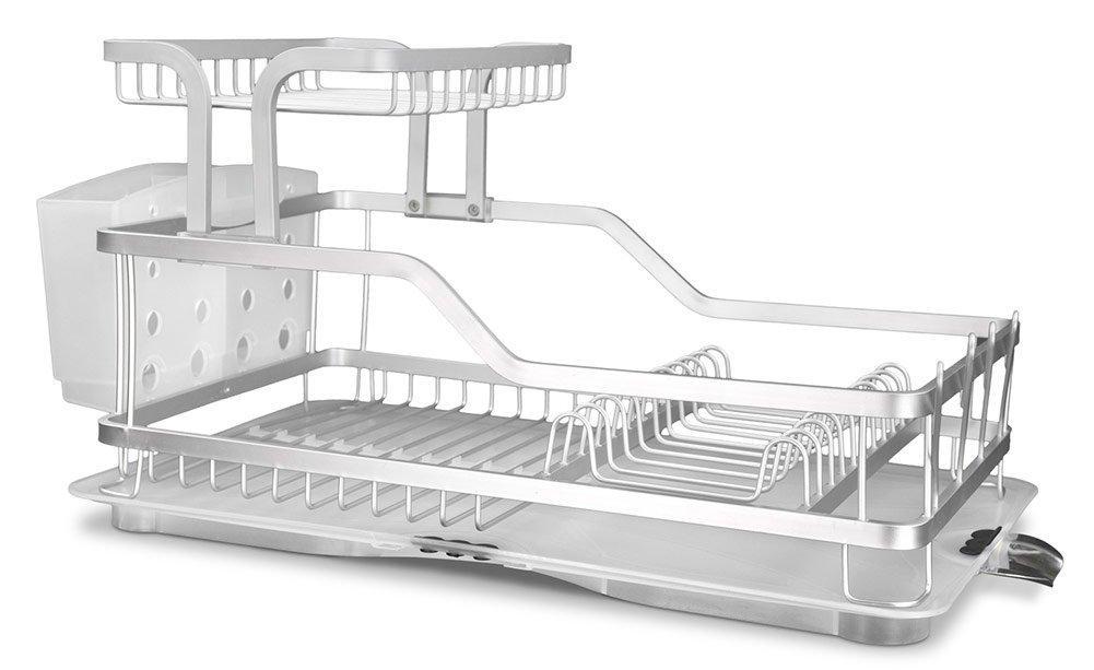 Details: Dry your dishes the easy way with this dish drainer. Made from heavy duty aluminum that is rust resistant. Removable tray with drainage spout. Side mounting cutlery holder. Two tiered to provide ample space for drying the dishes. Looks great in any kitchen setting.