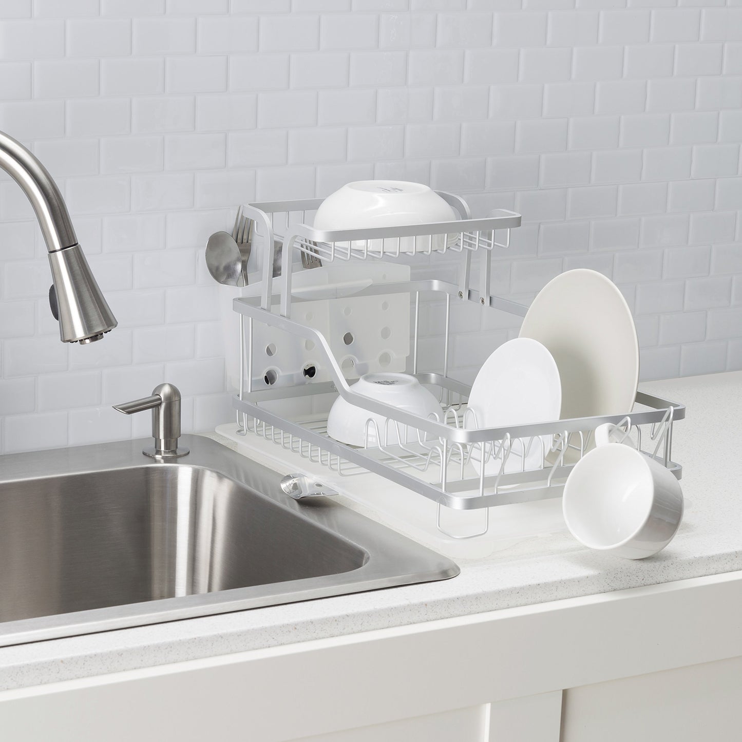 Home Basics DD44560 2-Tier Aluminum Dish Drying Storage Rack with Utensil Holder, Cup Holder & Draining Tray for Kitchen Countertop Sink